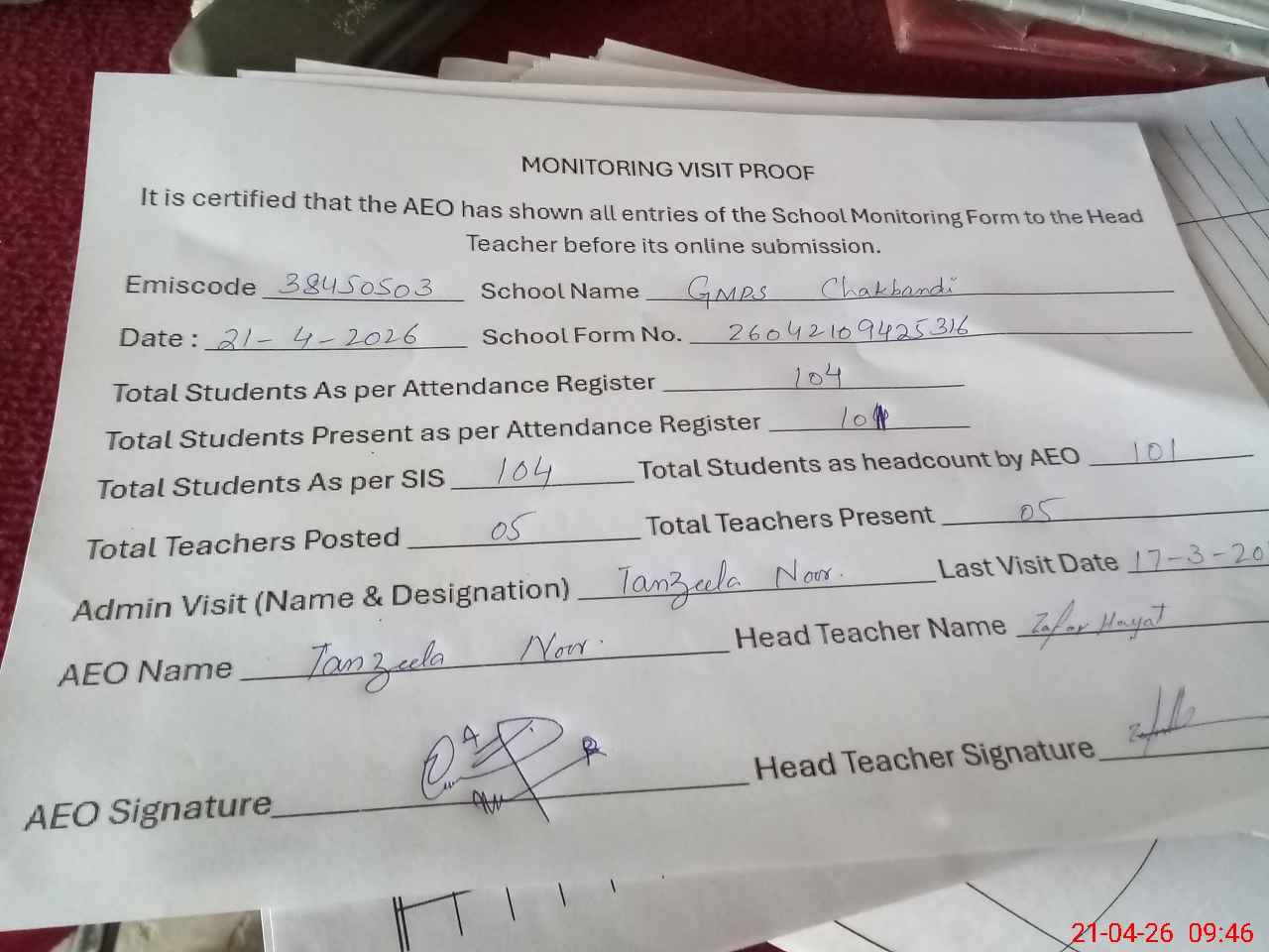 | Attendance Register | Head Teacher | MEA with School | Visit Proof |