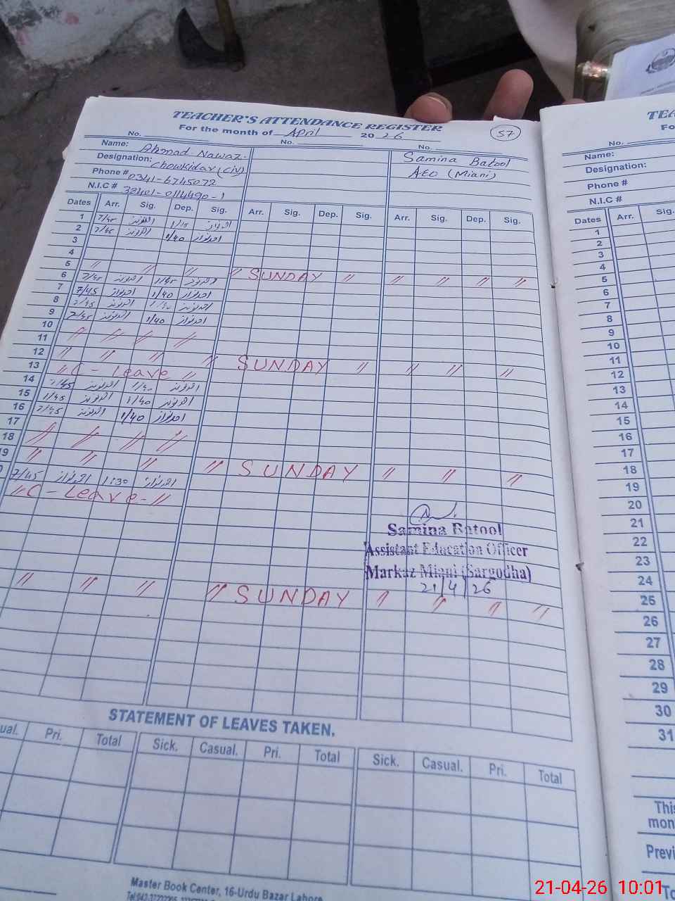 | Name: Na**** Pe**** Designation: (School Headmaster's/Headmistress's) PST Phone/Cell Number: 03**** |