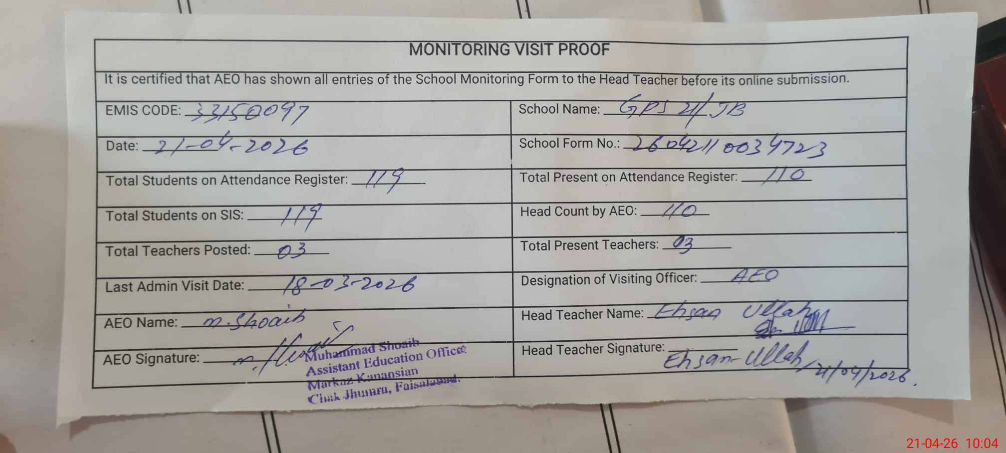 | EMIS Code: 33150097 | Name of School: GPS 21 JB | |||