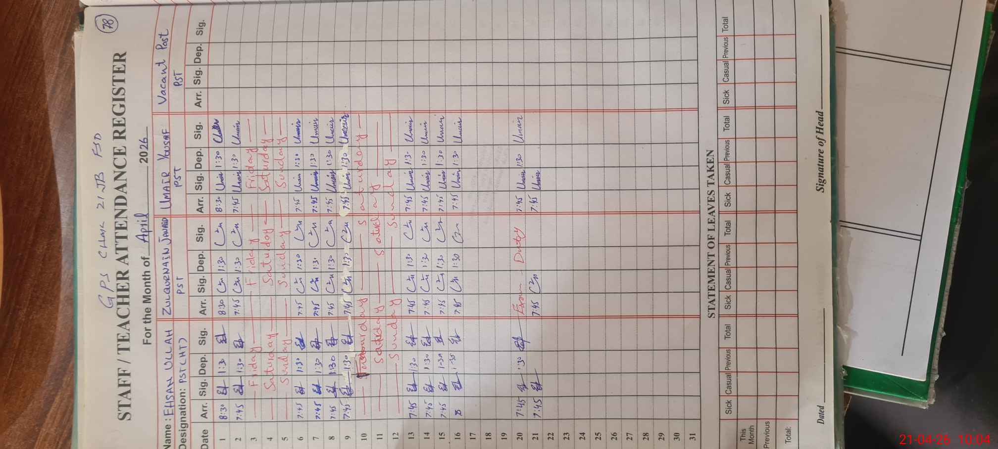 | Name: EH**** CH**** Designation: (School Headmaster's/Headmistress's) PST Phone/Cell Number: 03**** |