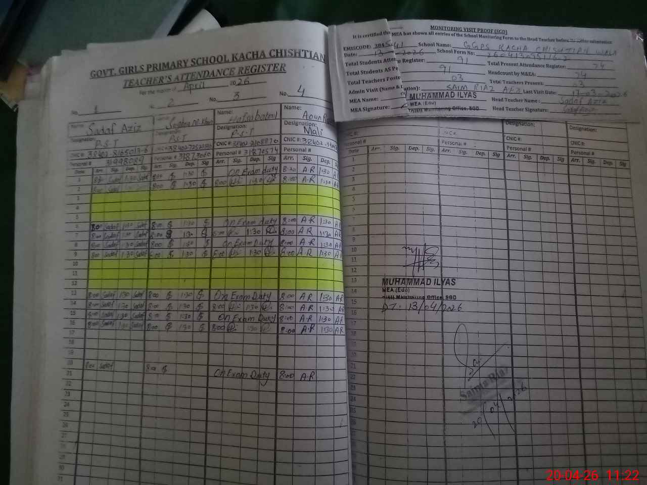 | Attendance Register | Head Teacher | MEA with School | Visit Proof |
