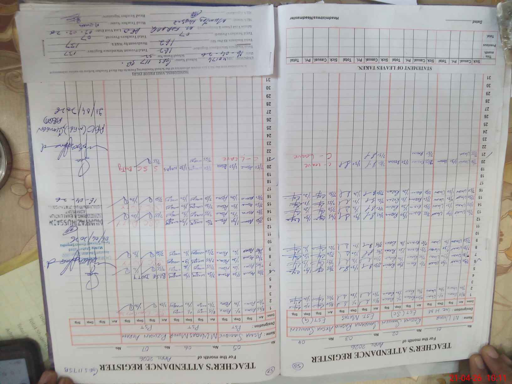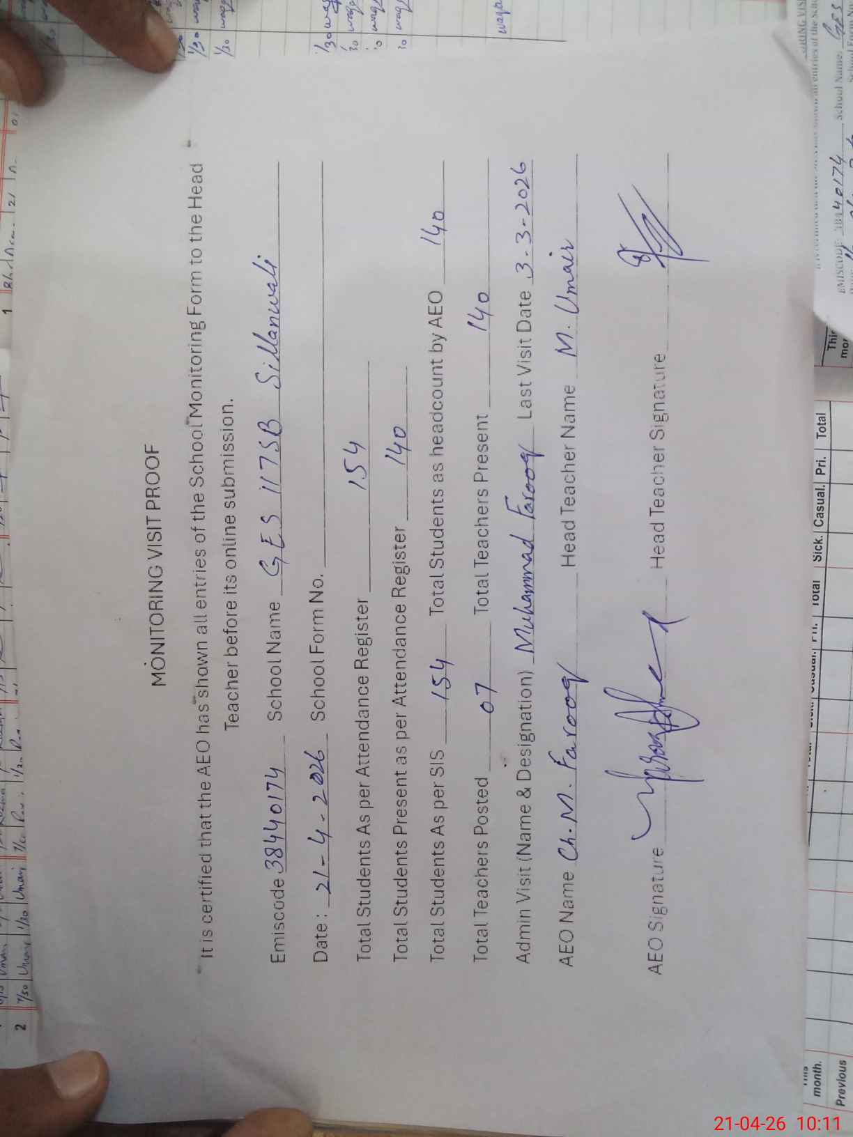 | Attendance Register | Head Teacher | MEA with School | Visit Proof |