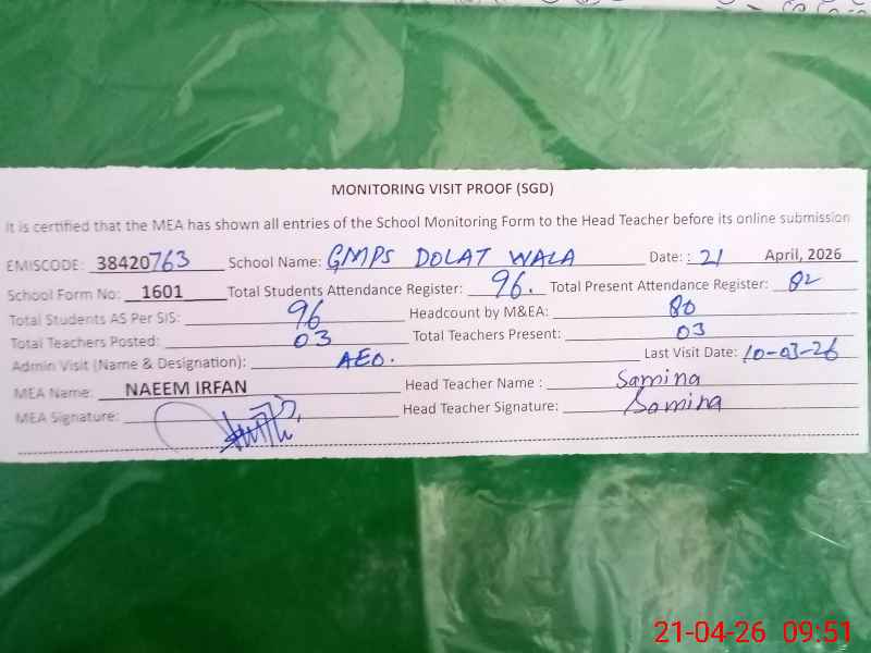 | EMIS Code: 38420763 | Name of School: GMPS DOLAT WALA | |||
