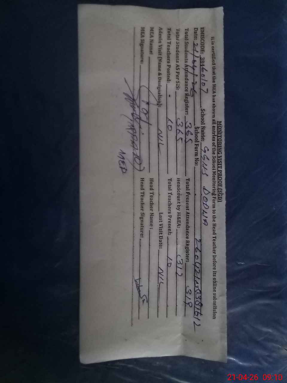 | Attendance Register | Head Teacher | MEA with School | Visit Proof |