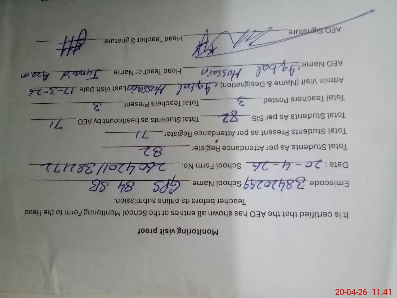 | Attendance Register | Head Teacher | MEA with School | Visit Proof |