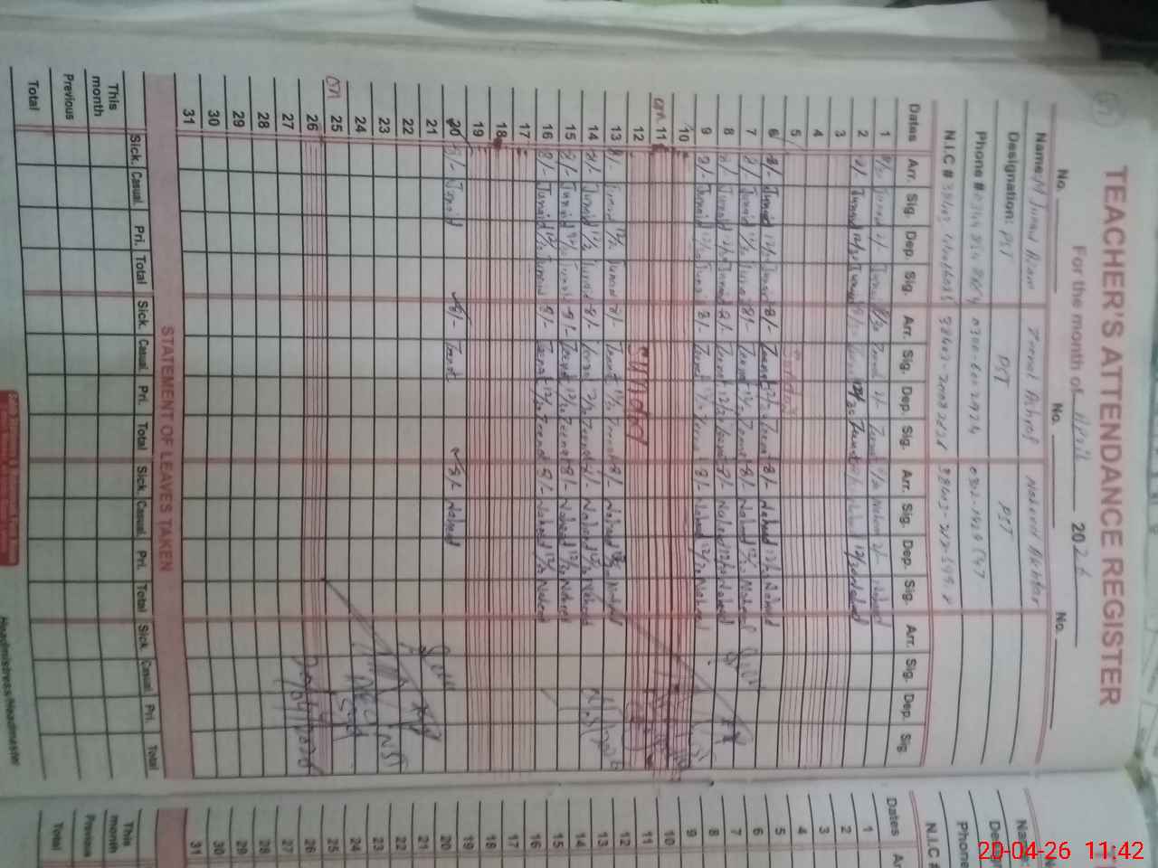 | CNIC | Full Name | Designation | R/C | Absence During Last Calender Month |