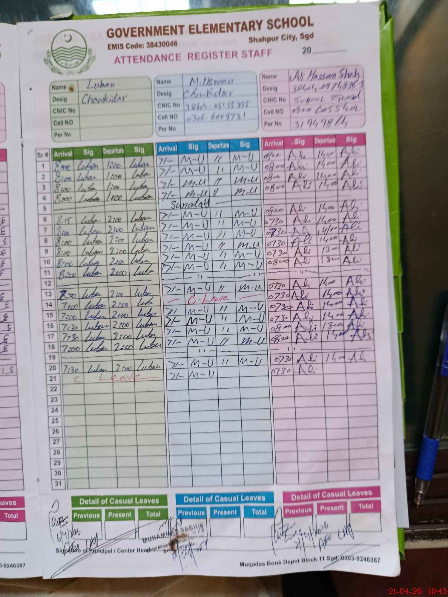 | CNIC | Full Name | Designation | R/C | Absence During Last Calender Month |