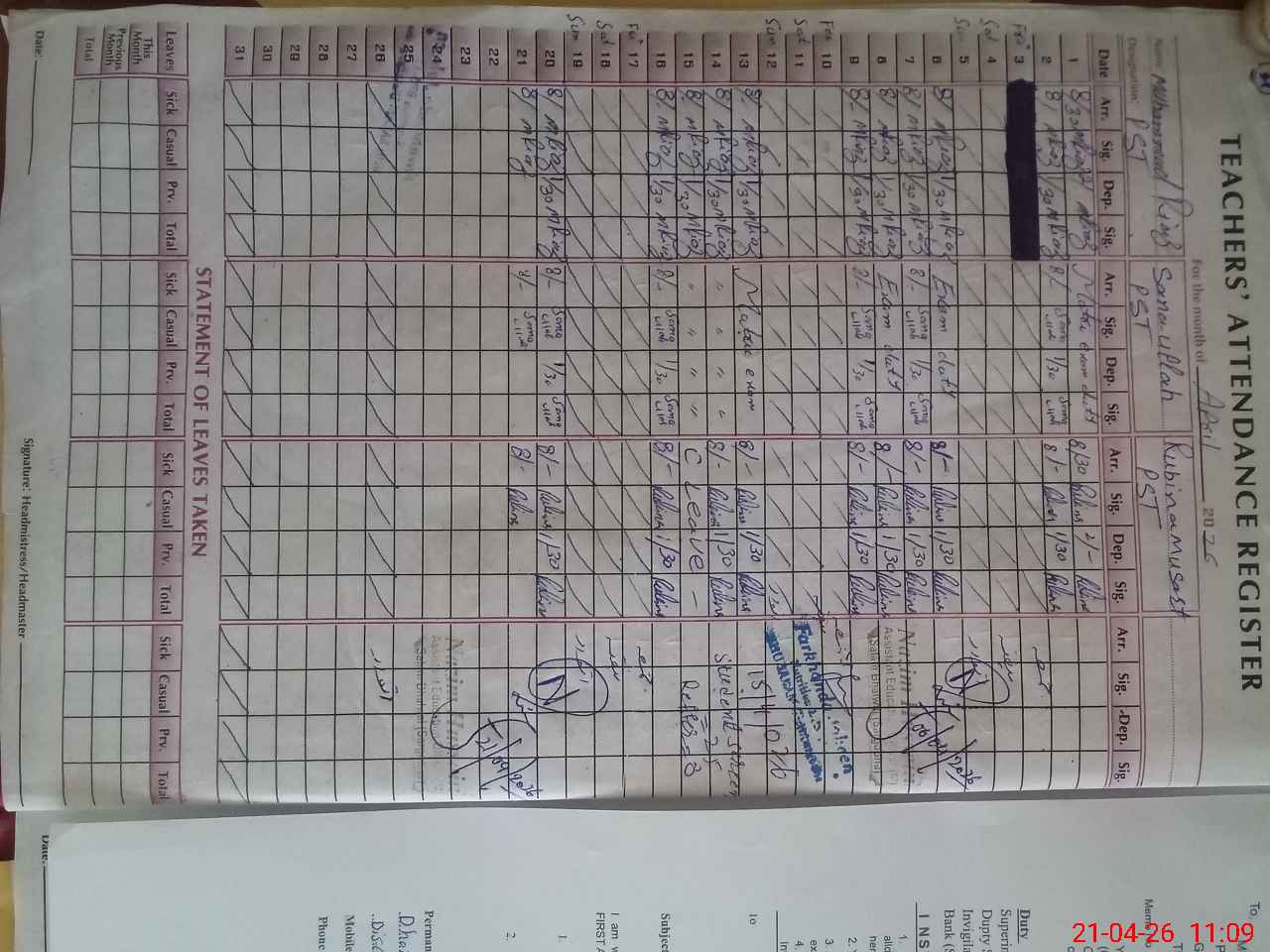 | Name: MU**** RI**** Designation: (School Headmaster's/Headmistress's) PST Phone/Cell Number: 03**** |
