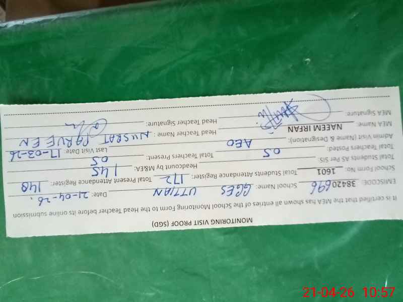 | Attendance Register | Head Teacher | MEA with School | Visit Proof |