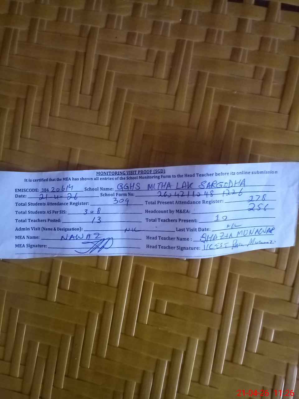 | EMIS Code: 38420614 | Name of School: GGHS MITHA LAK SARGODHA | |||