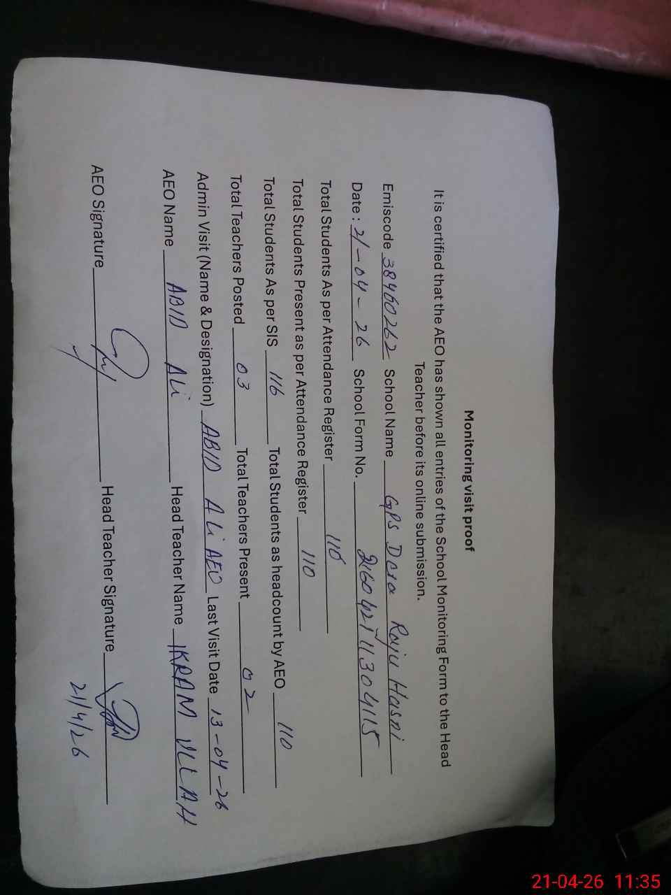 | Certified that this School was Inspected by the Undersigned MEA/DMO Today and the Information Stated Above is as Per Record. | |||||