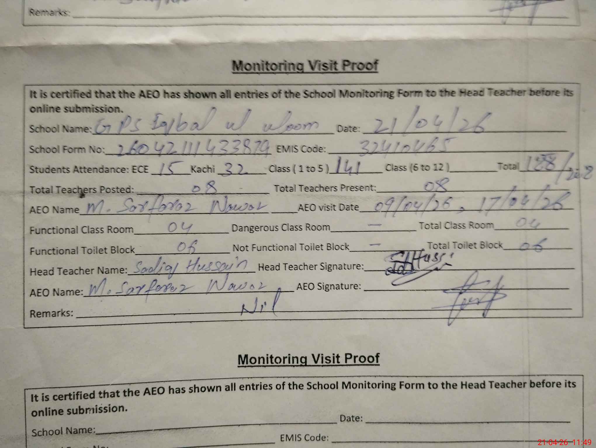 | EMIS Code: 32410465 | Name of School: GPS IQBAL-UL-ALOOM | |||
