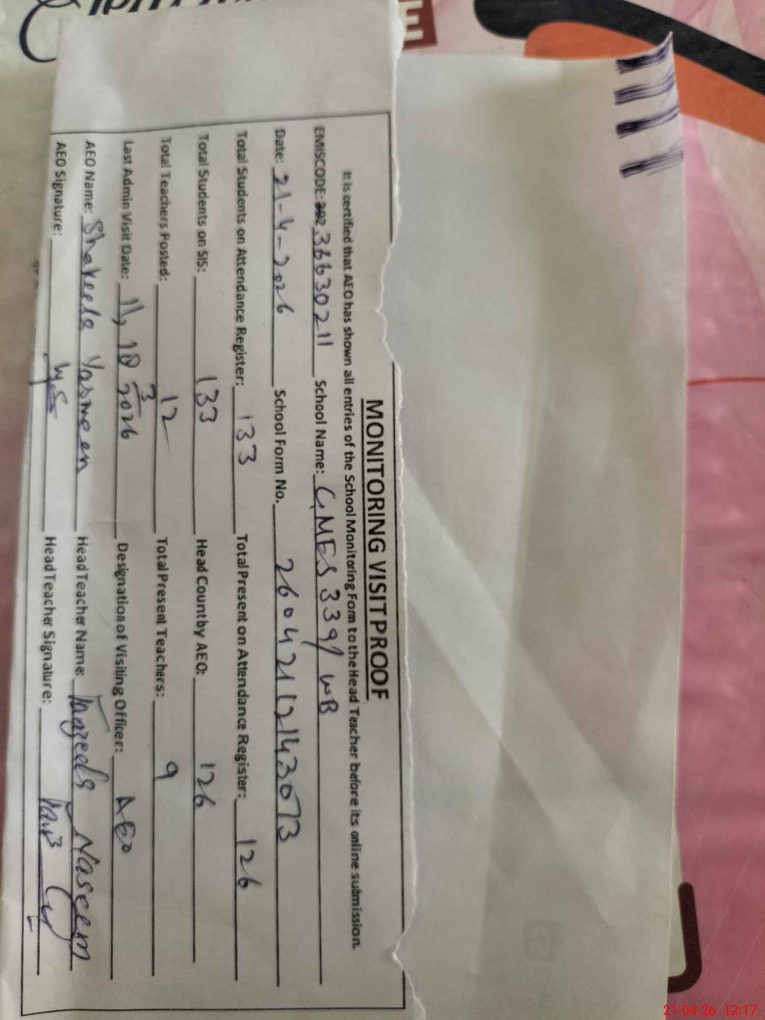 | Attendance Register | Head Teacher | MEA with School | Visit Proof |