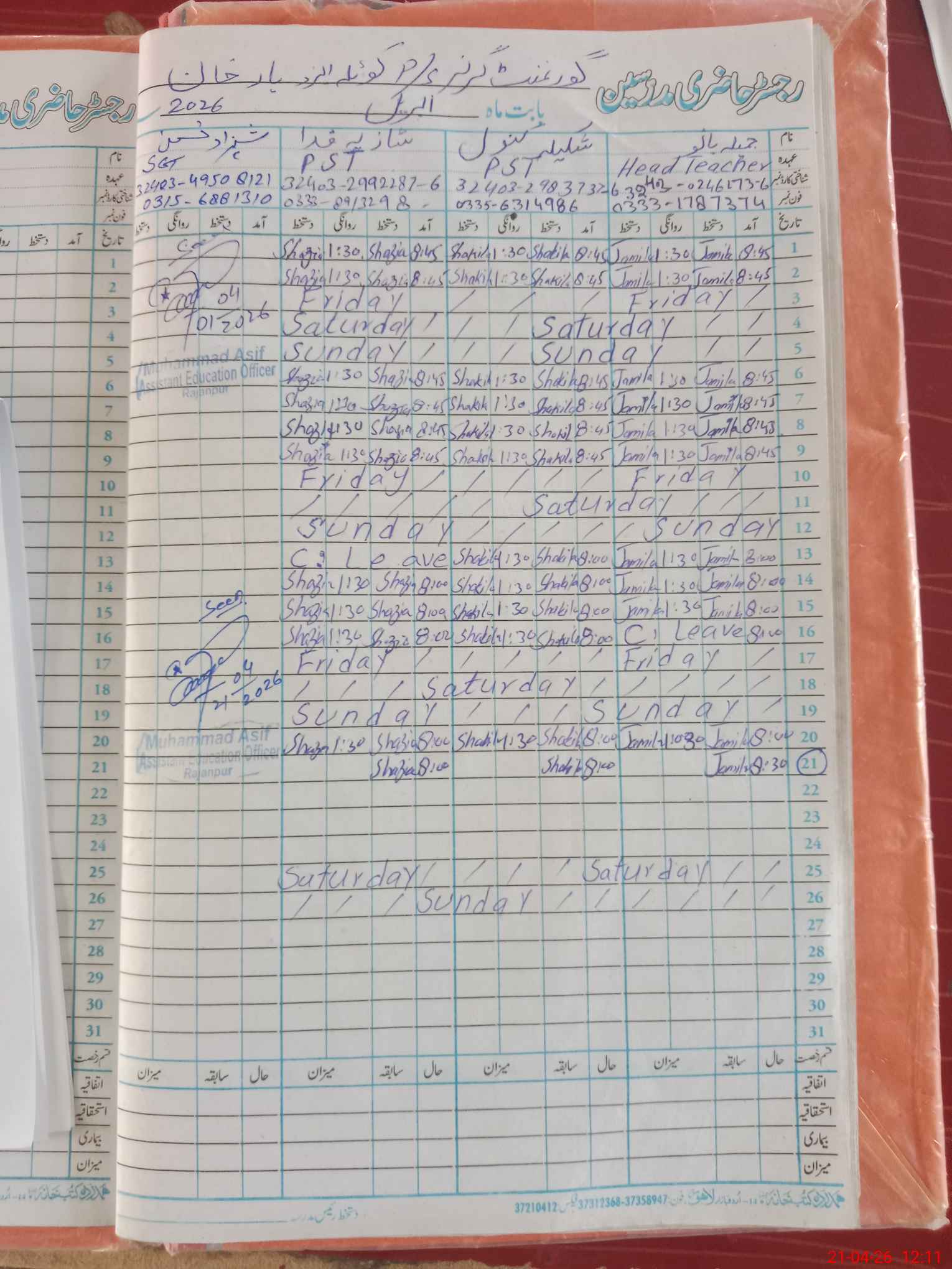 | Name: KH**** PE**** Designation: (School Headmaster's/Headmistress's) PST Phone/Cell Number: 03**** |
