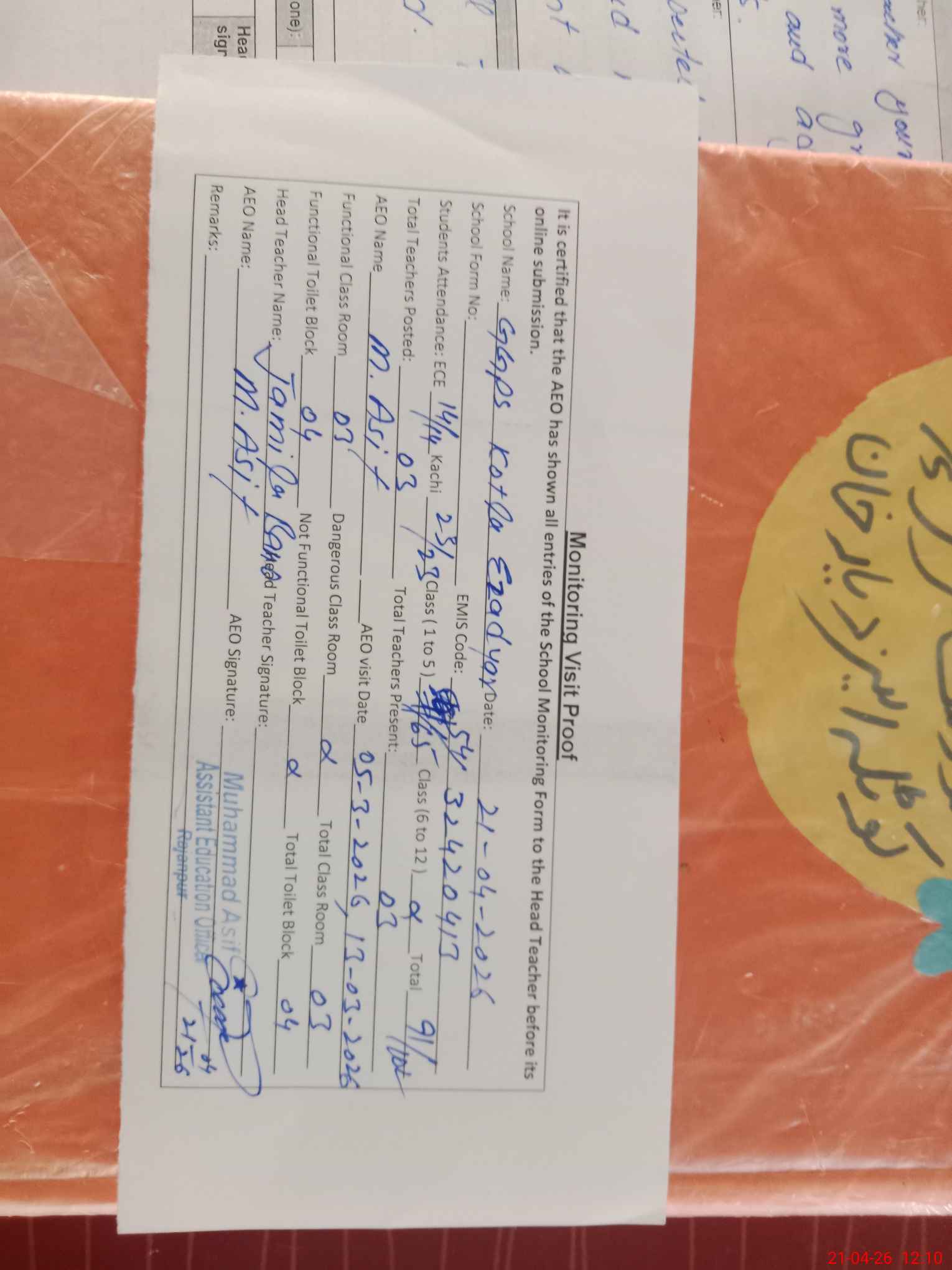 | Attendance Register | Head Teacher | MEA with School | Visit Proof |