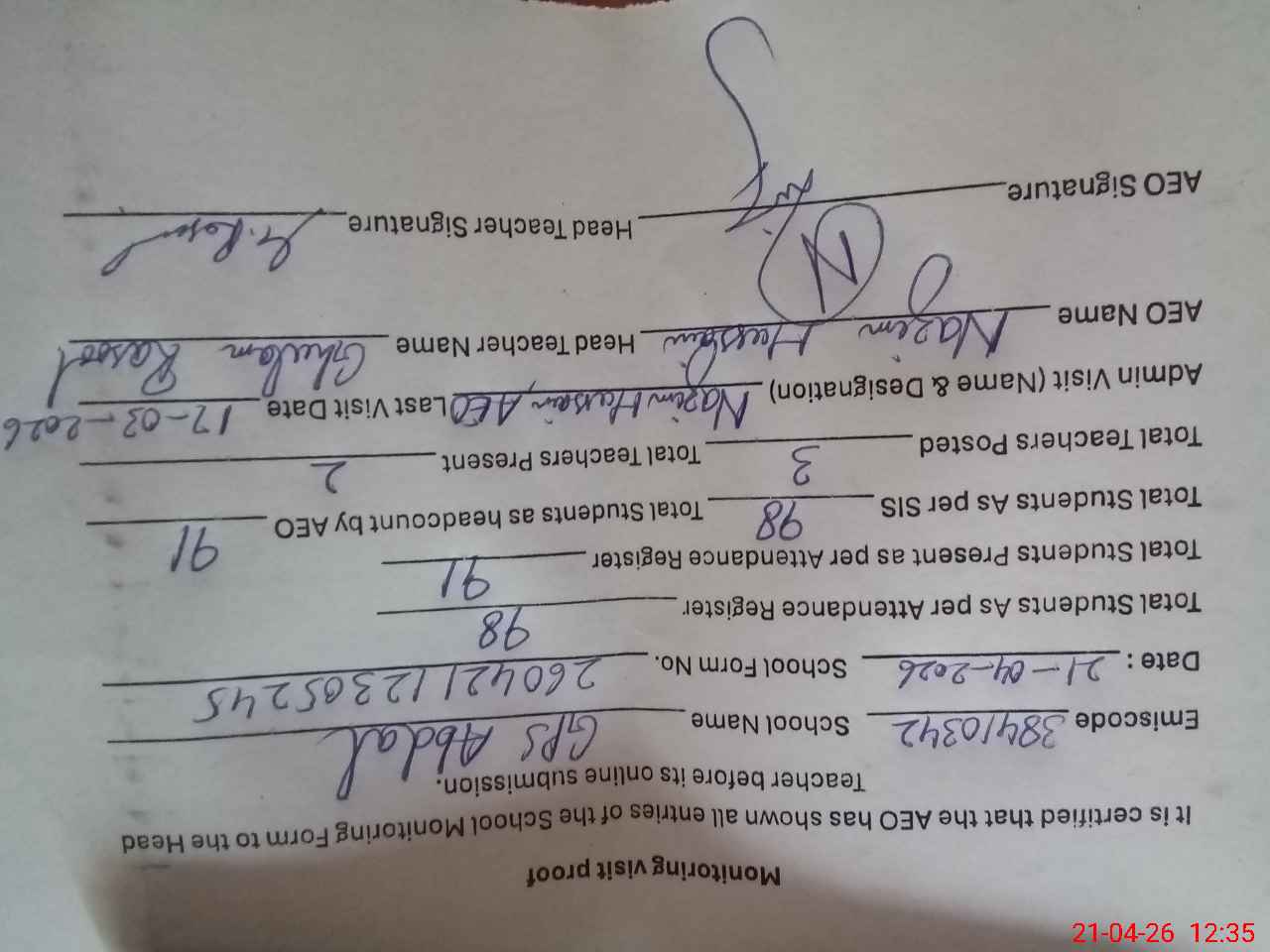 | Attendance Register | Head Teacher | MEA with School | Visit Proof |