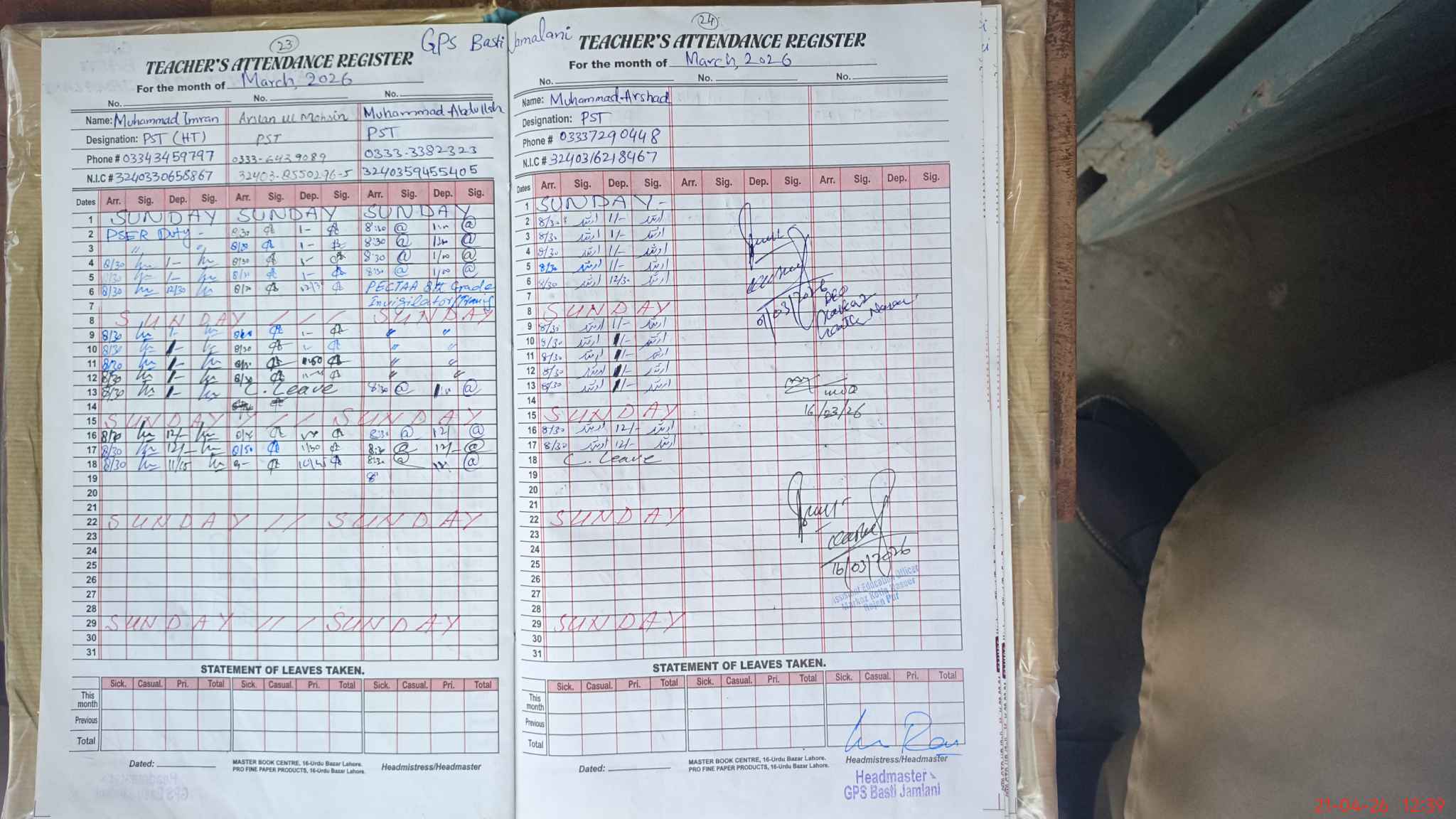 | Name: MU**** IM**** Designation: (School Headmaster's/Headmistress's) PST Phone/Cell Number: 03**** |