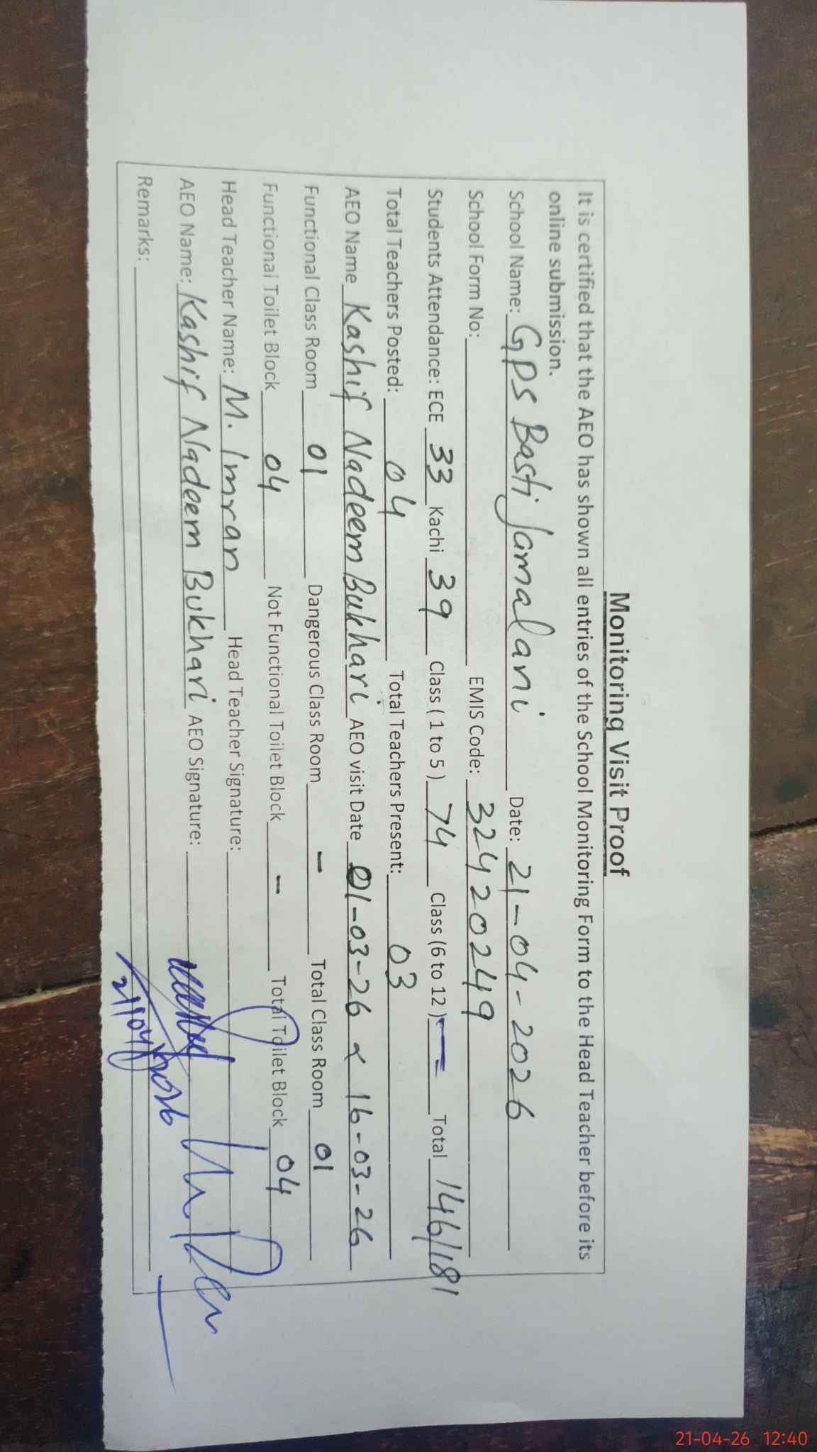 | EMIS Code: 32420249 | Name of School: GPS BASTI JAMALANI | |||