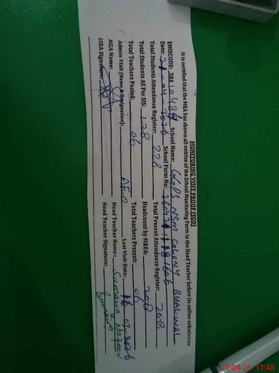 | EMIS Code: 38410484 | Name of School: GGPS NOON SUGAR MILLS COLONY BHALWAL | |||