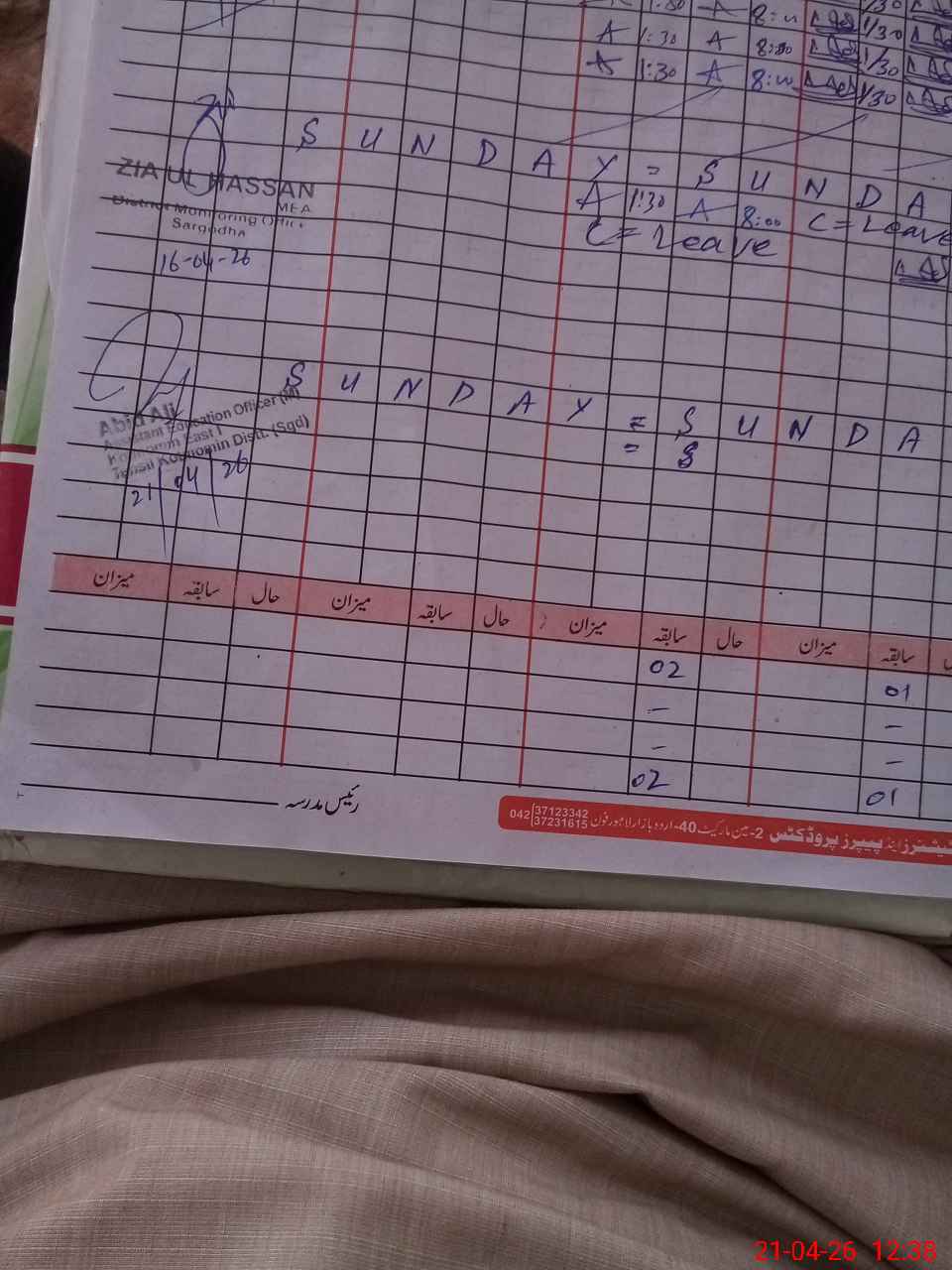 | CNIC | Full Name | Designation | R/C | Absence During Last Calender Month |