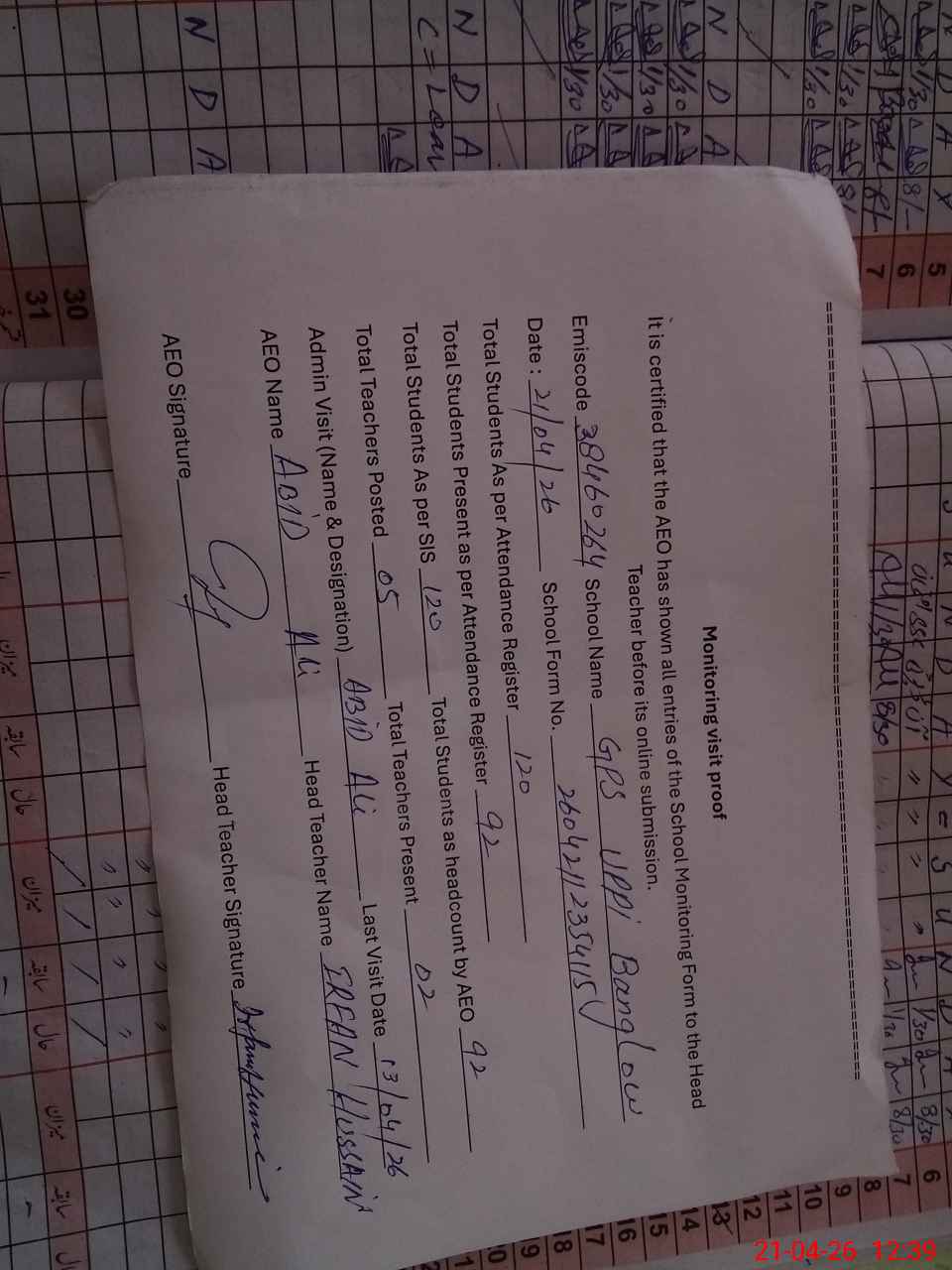 | Attendance Register | Head Teacher | MEA with School | Visit Proof |