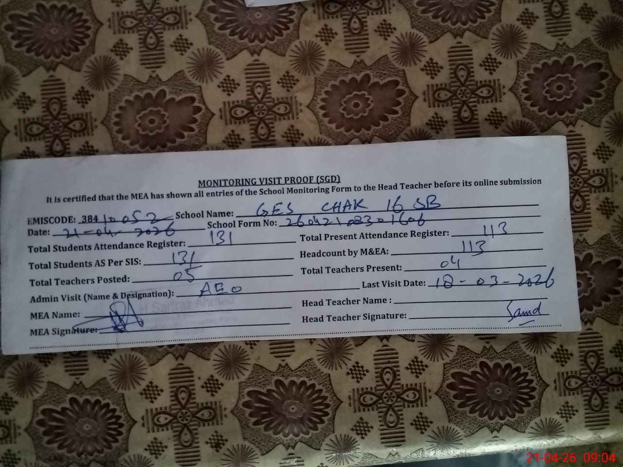 | EMIS Code: 38410052 | Name of School: GES CHAK NO.16 SB | |||