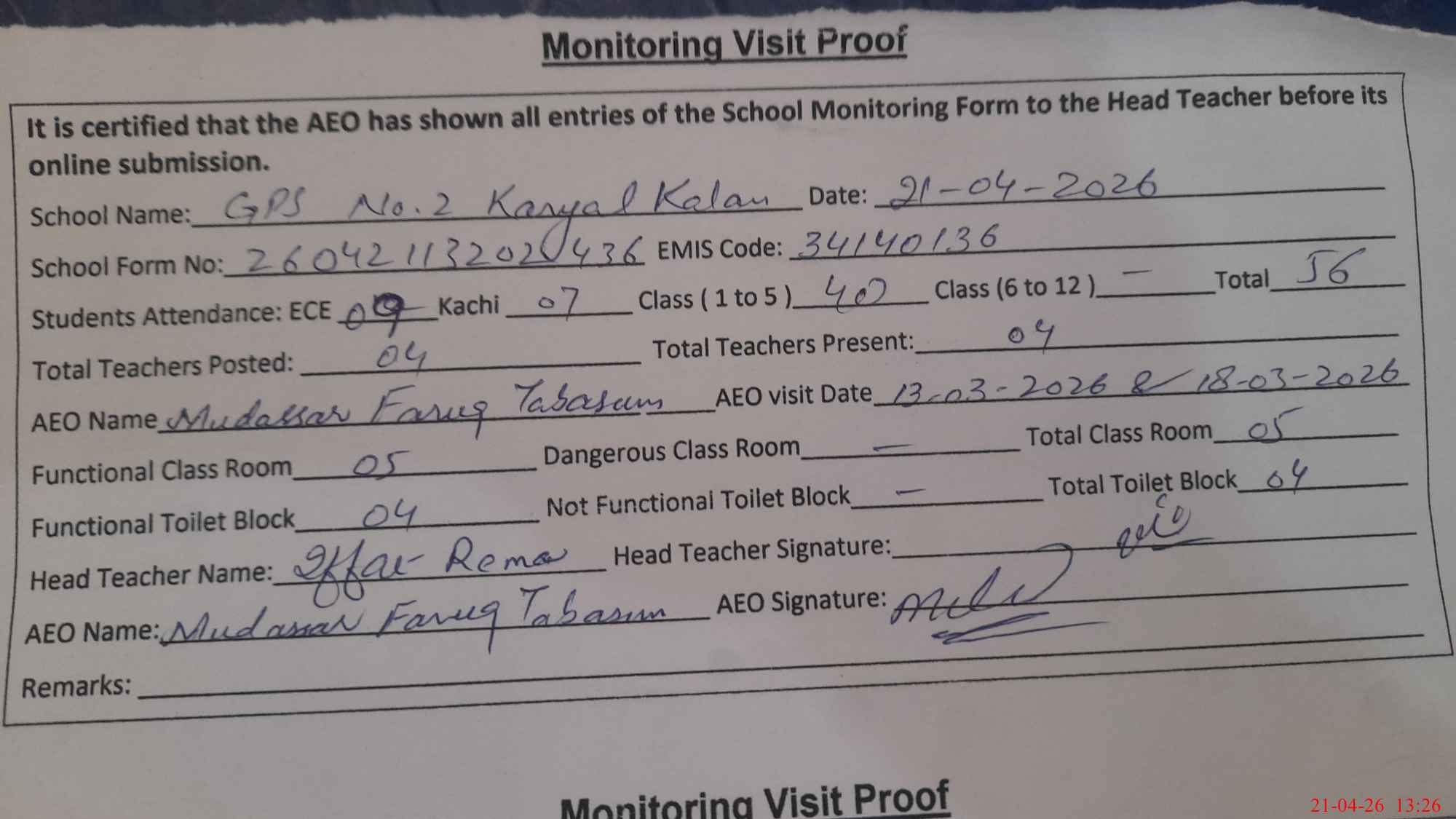 | Attendance Register | Head Teacher | MEA with School | Visit Proof |