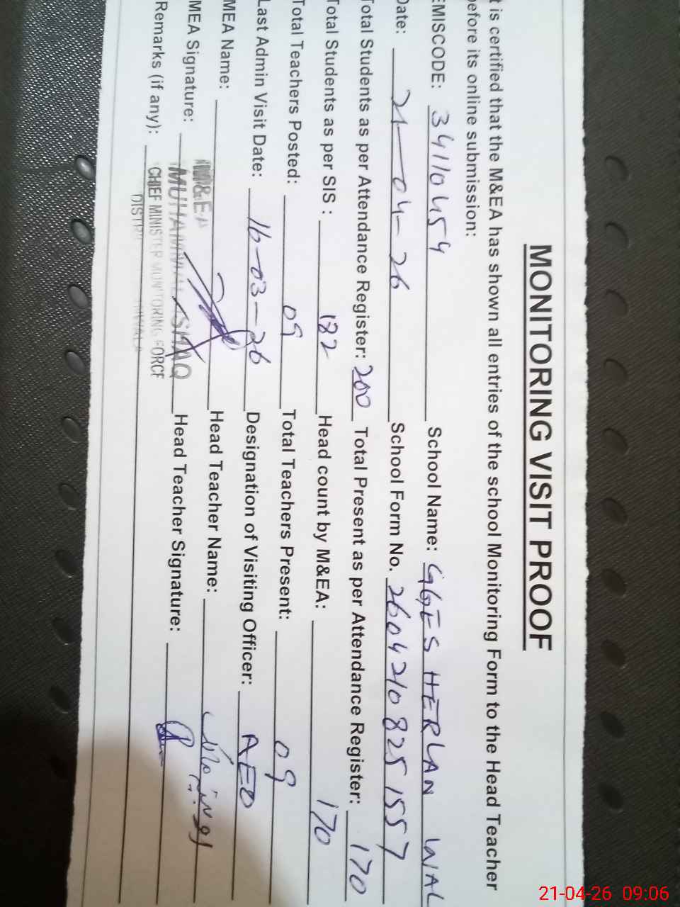 | Attendance Register | Head Teacher | MEA with School | Visit Proof |