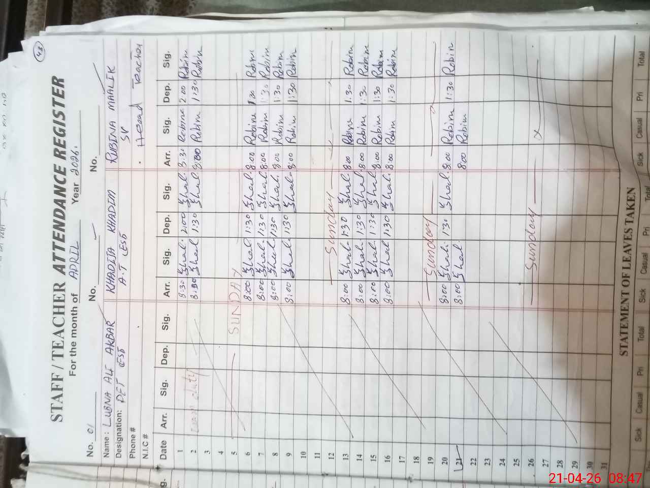 | CNIC | Full Name | Designation | R/C | Absence During Last Calender Month |