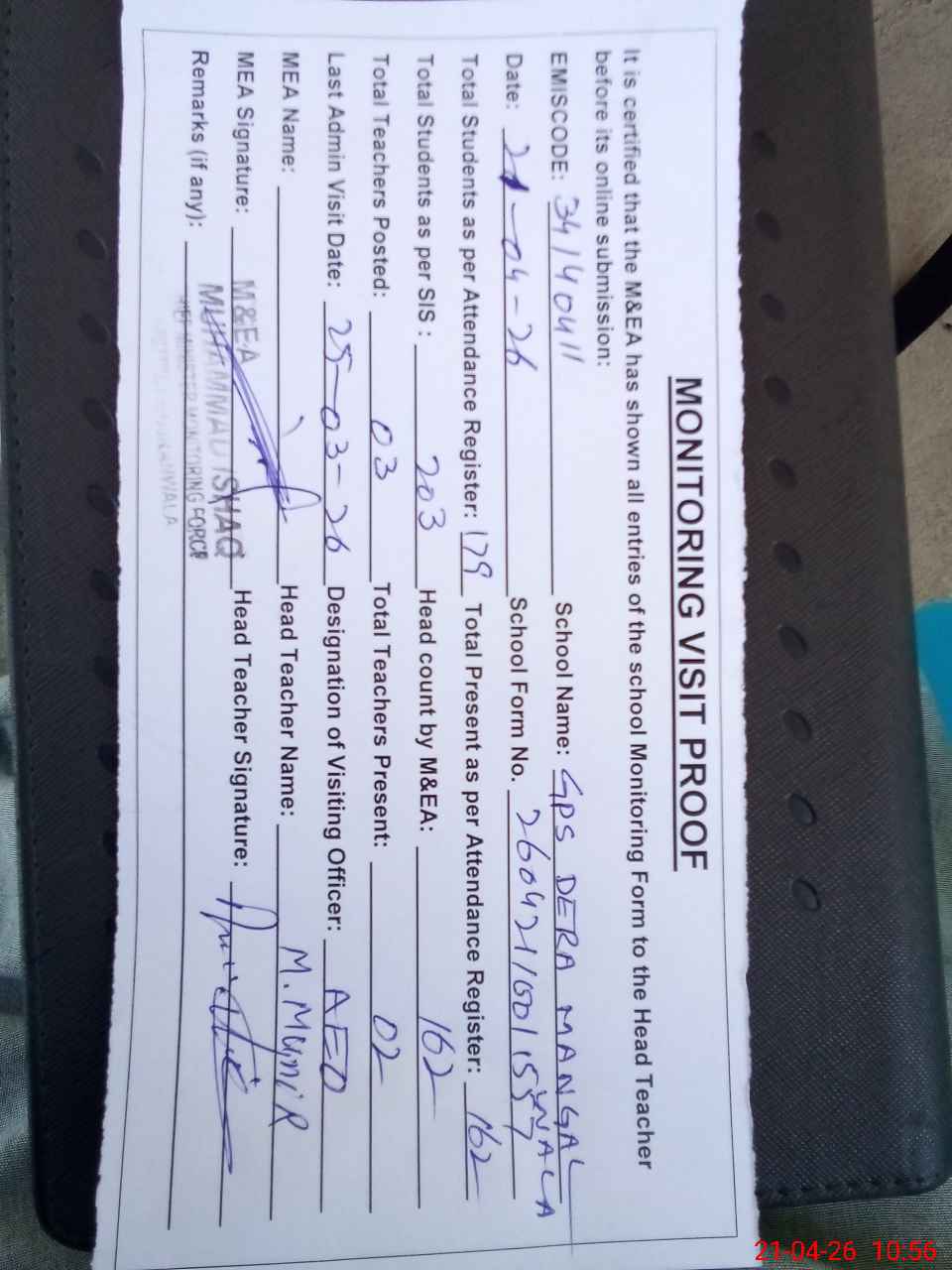 | Attendance Register | Head Teacher | MEA with School | Visit Proof |
