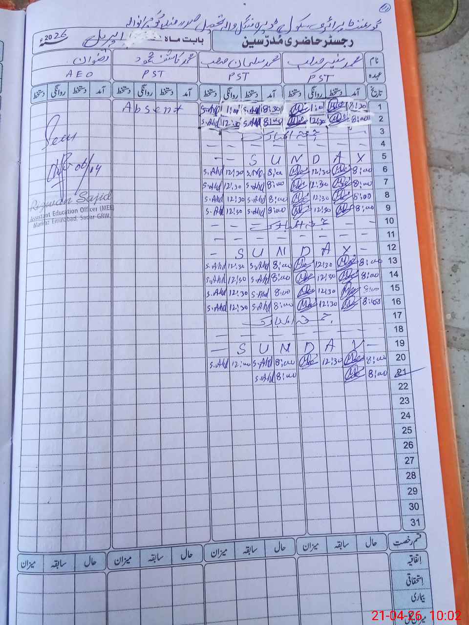 | CNIC | Full Name | Designation | R/C | Absence During Last Calender Month |