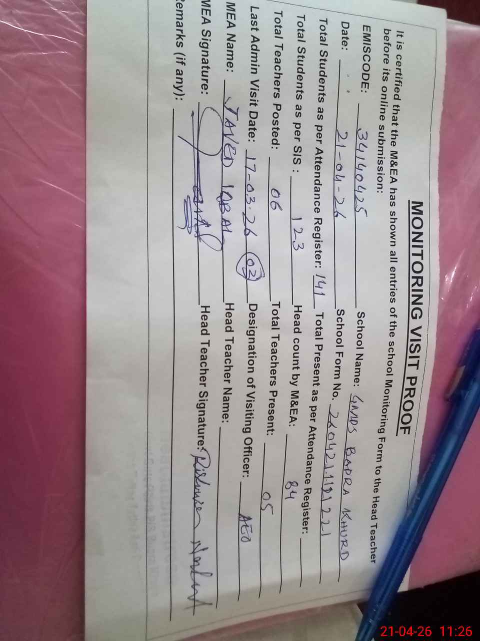 | Attendance Register | Head Teacher | MEA with School | Visit Proof |