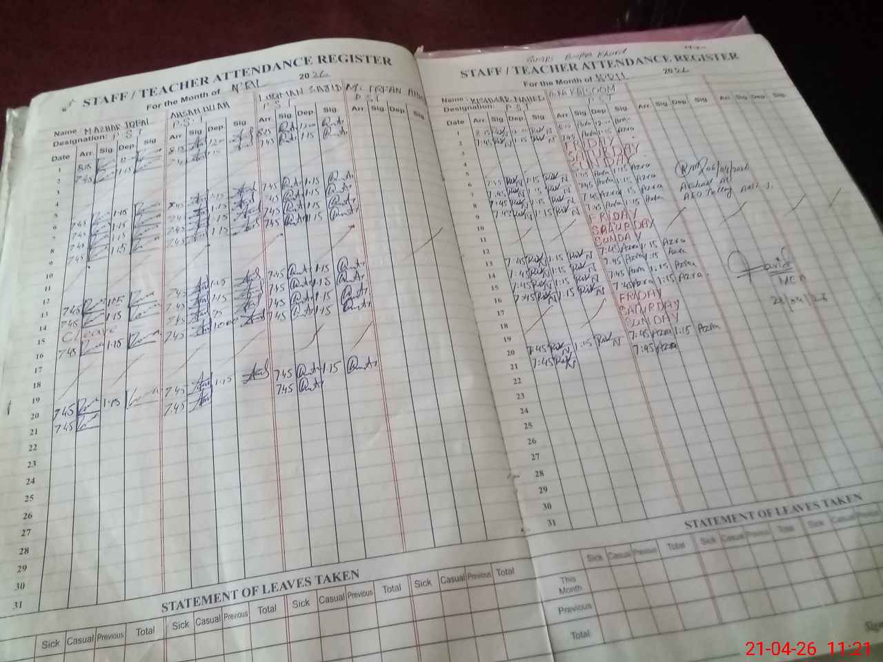 | Leave | Duty | Absent | Maternity | Medical | Ex- Pak |