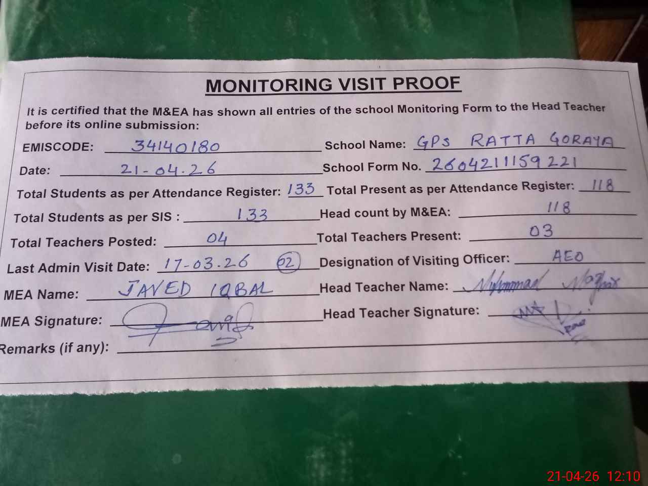 | Attendance Register | Head Teacher | MEA with School | Visit Proof |
