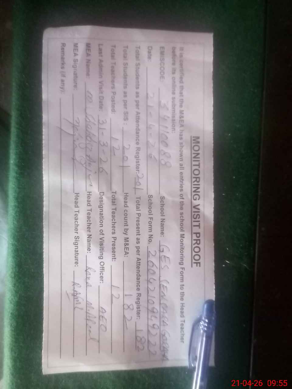 | Attendance Register | Head Teacher | MEA with School | Visit Proof |