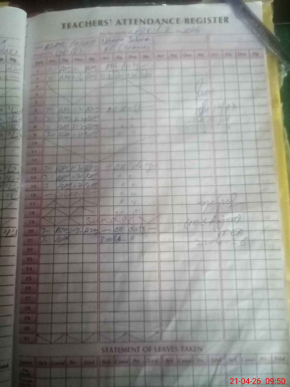 | Leave | Duty | Absent | Maternity | Medical | Ex- Pak |
