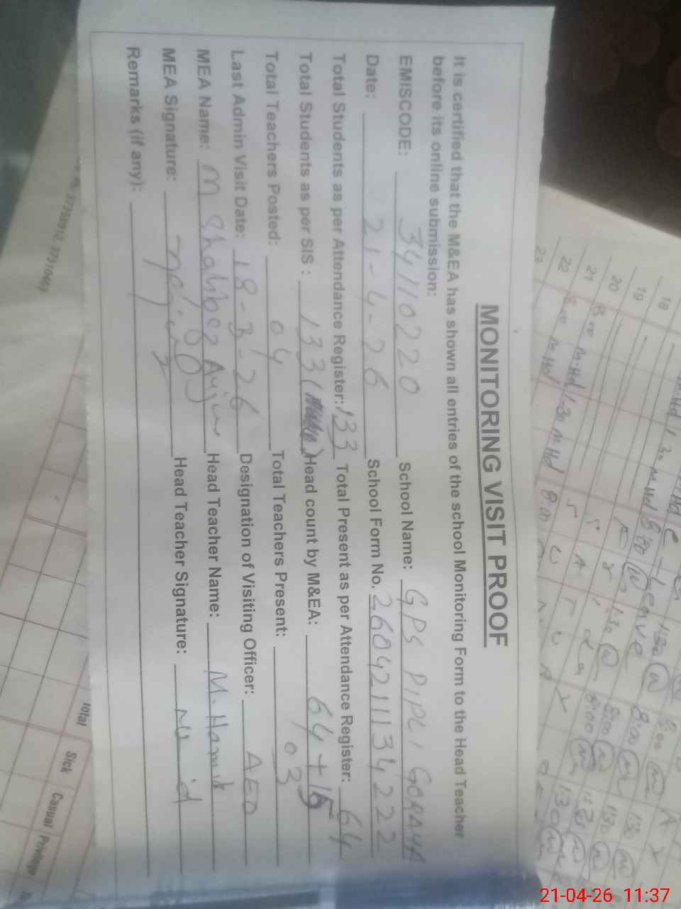 | Attendance Register | Head Teacher | MEA with School | Visit Proof |