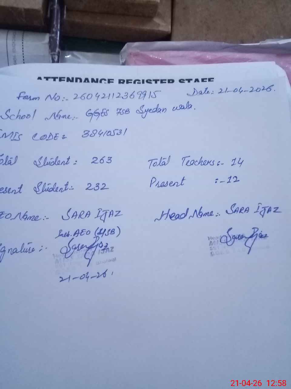 | Name: SA**** IJ**** Designation: (School Headmaster's/Headmistress's) HM Phone/Cell Number: 03**** |