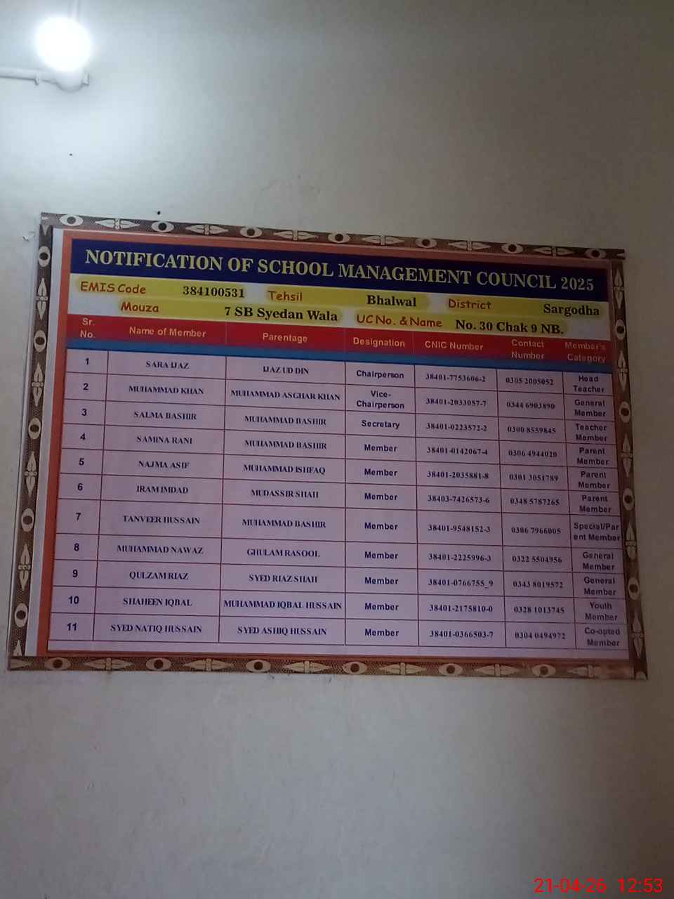 | EMIS Code: 38410531 | Name of School: GGES CHAK NO. 7 SB SYEDAN WALA | |||