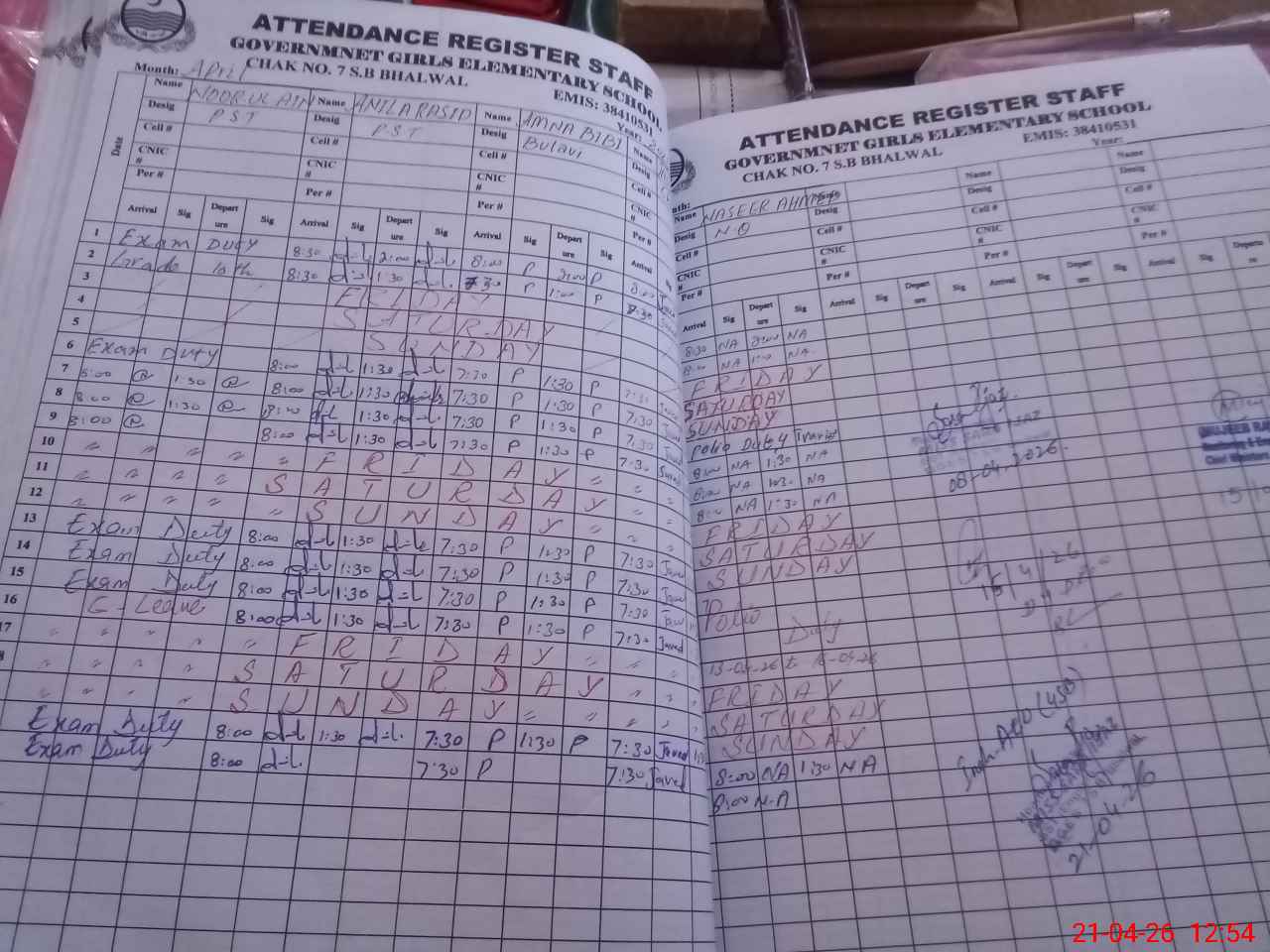 | CNIC | Full Name | Designation | R/C | Absence During Last Calender Month |