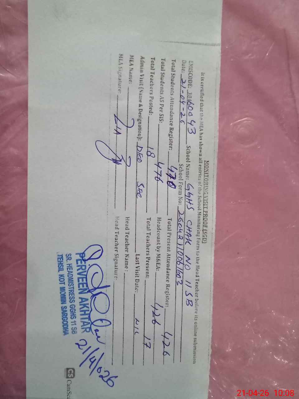 | EMIS Code: 38460043 | Name of School: GGHS CHAK NO.11 SB | |||