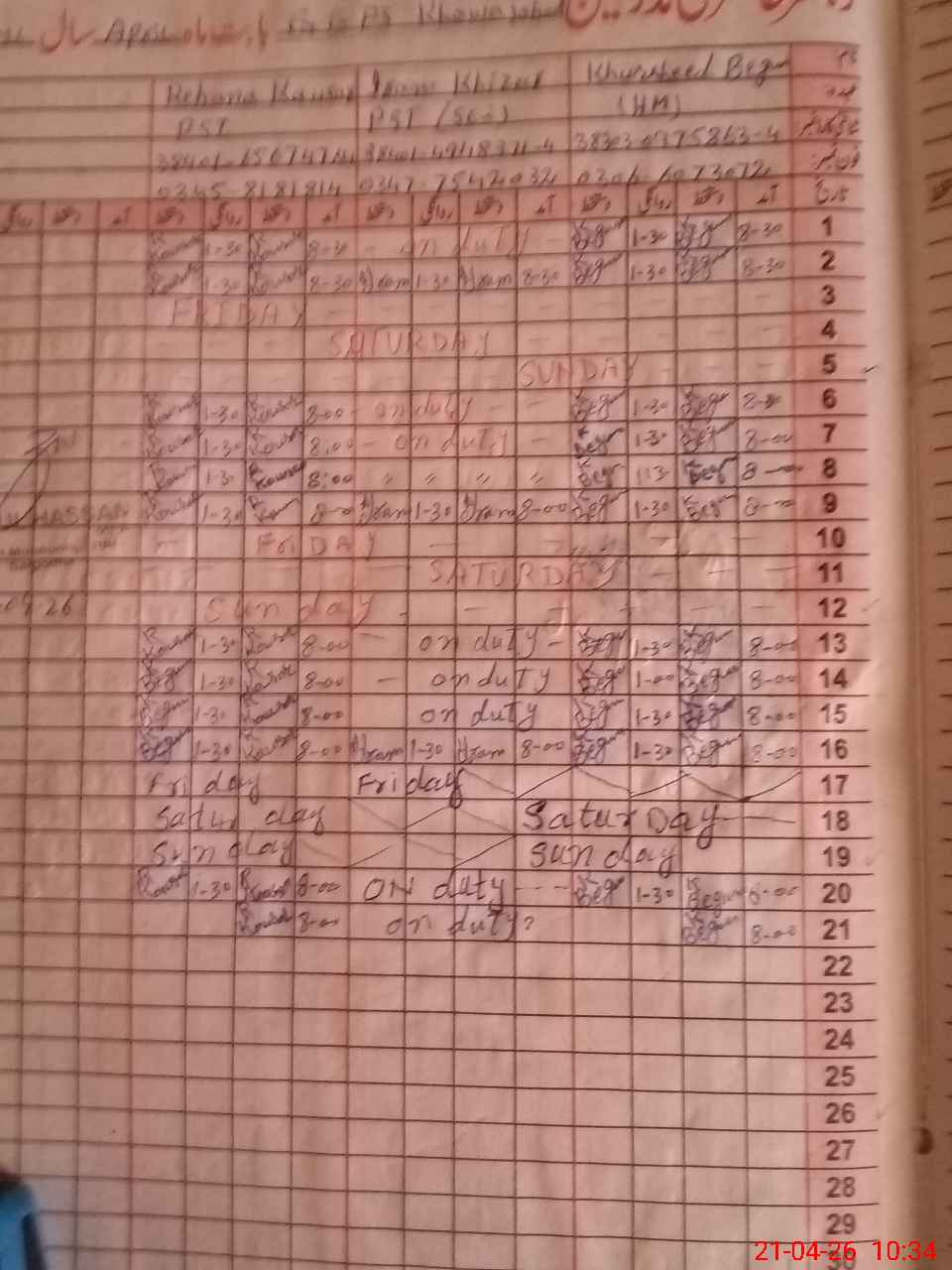 | 38**** | Ir**** Kh**** | PST Science/Maths | Regular | 0 | 0 | 0 | 0 | 0 | 0 | 0 | 0 | 0 | Exam Duty |