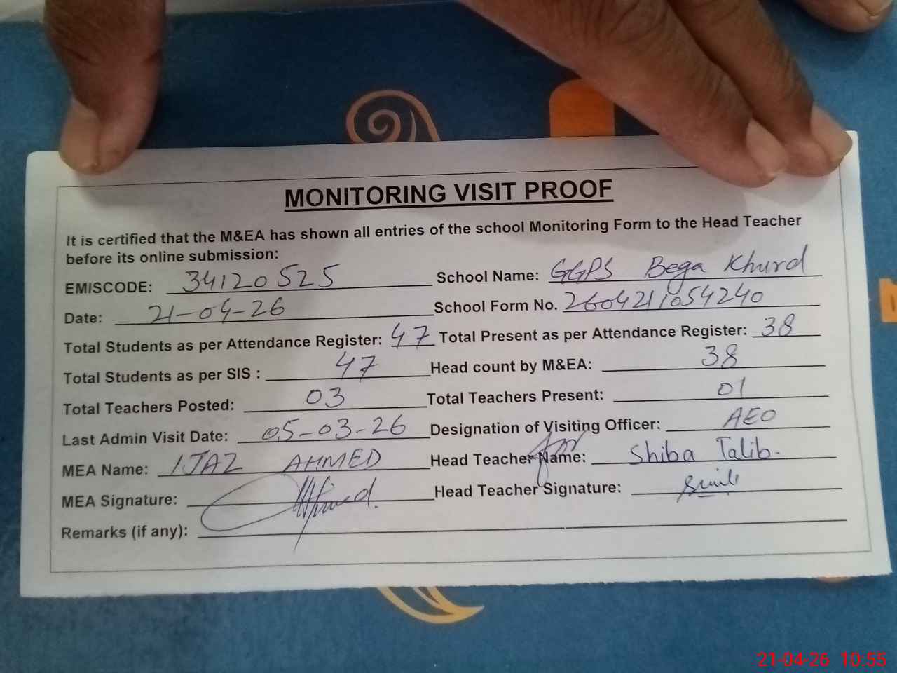 | EMIS Code: 34120525 | Name of School: GGPS BEGA KHURD | |||