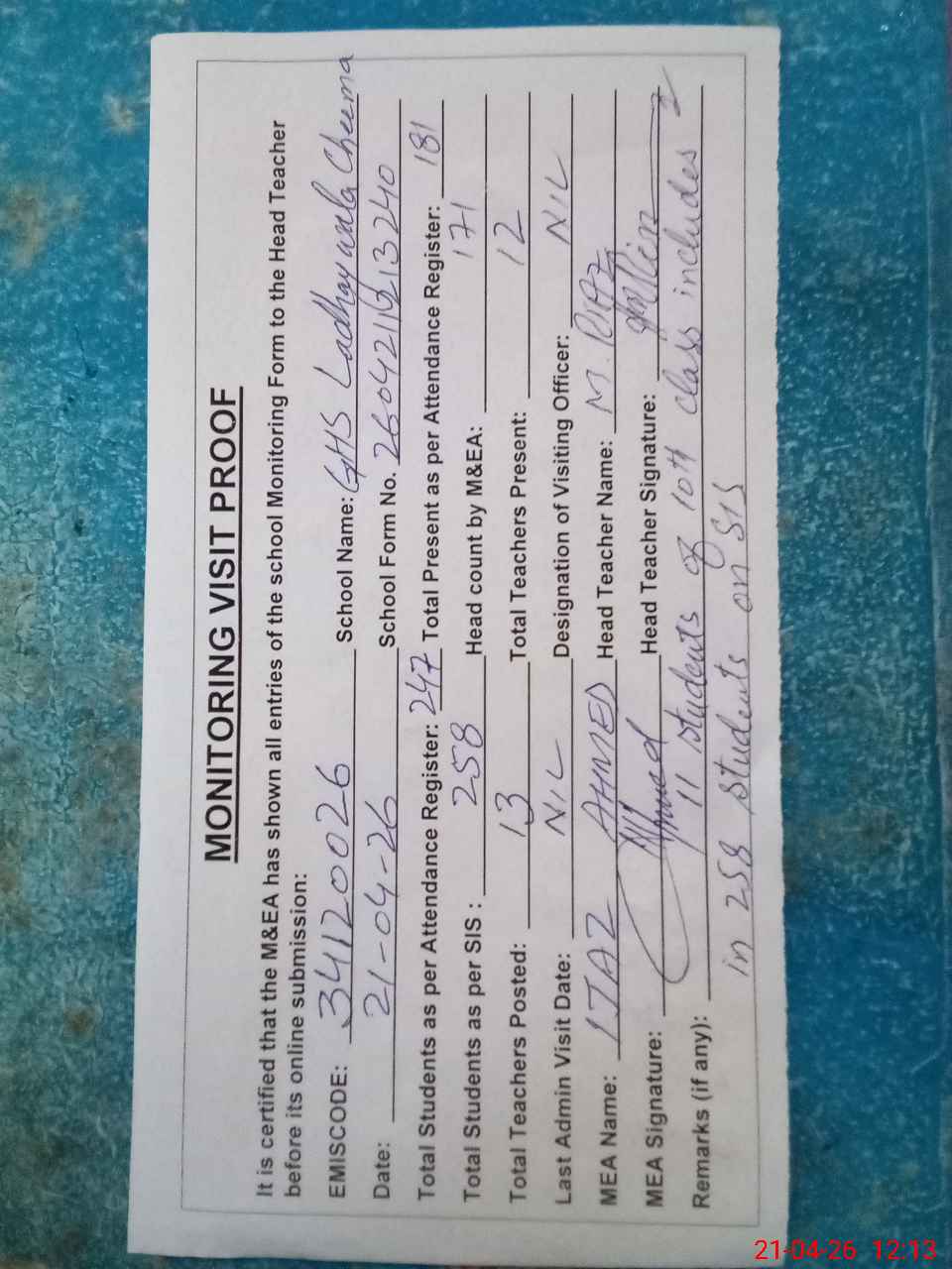 | Attendance Register | Head Teacher | MEA with School | Visit Proof |