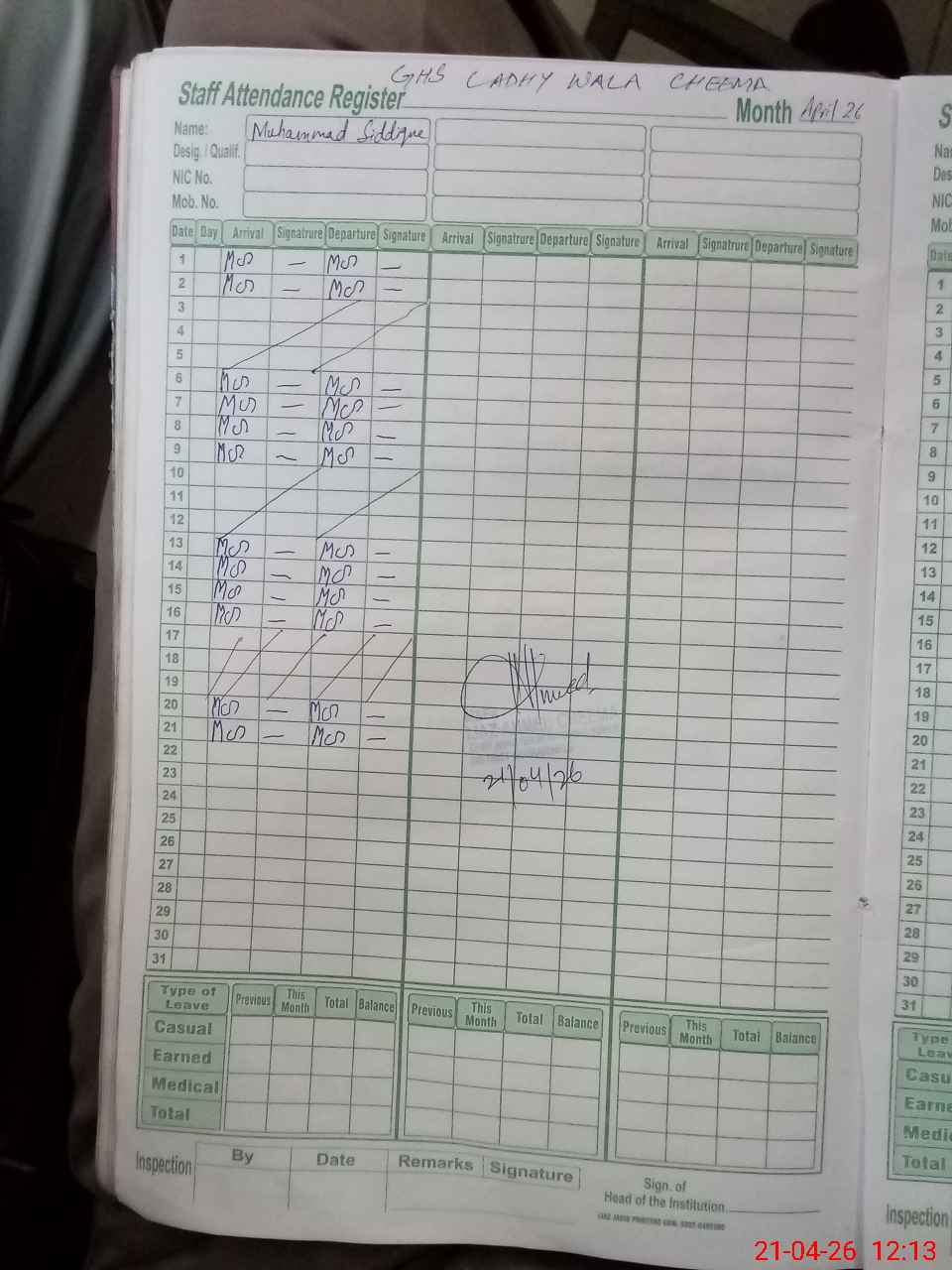 | CNIC | Full Name | Designation | R/C | Absence During Last Calender Month |