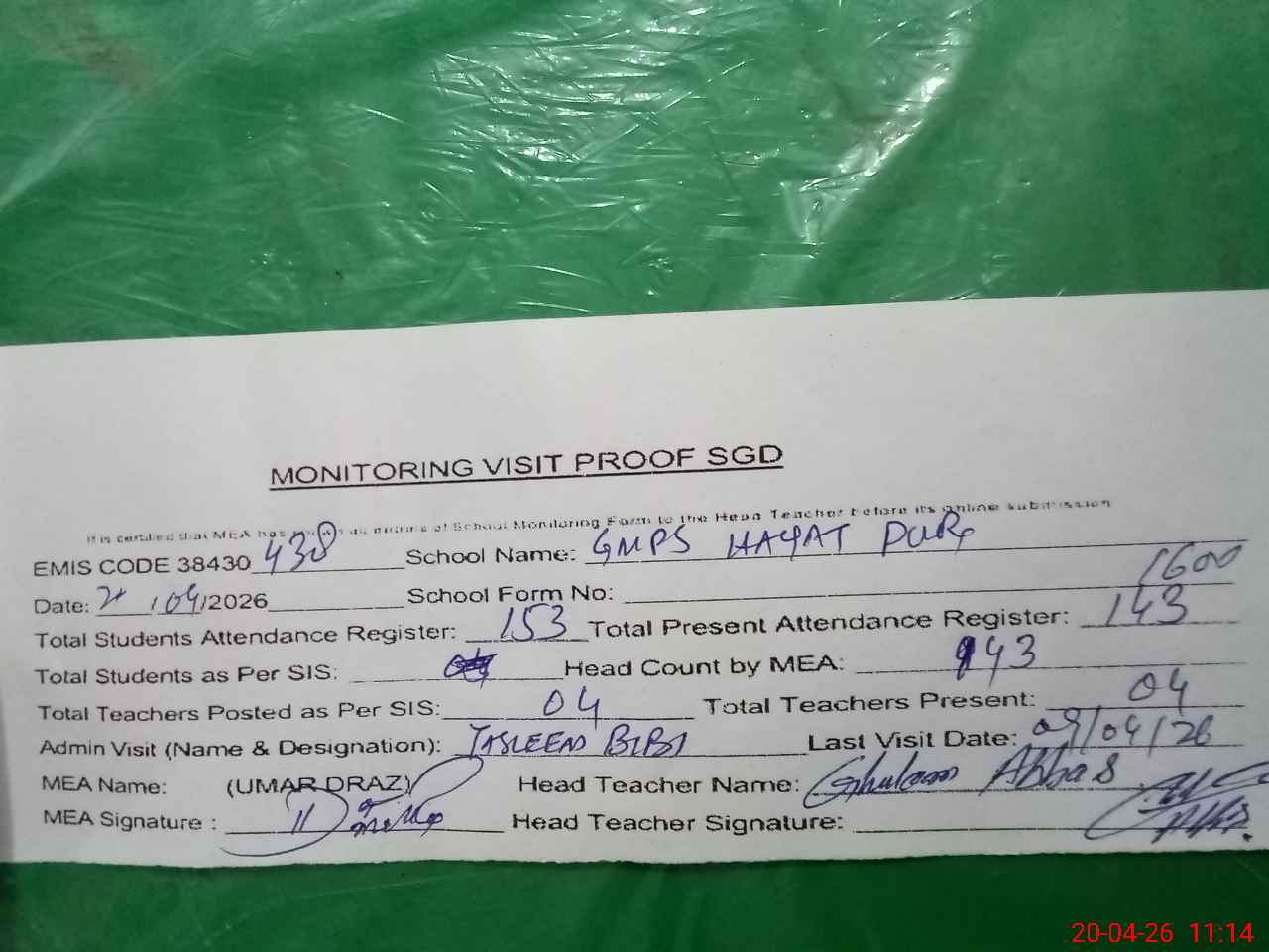 | Attendance Register | Head Teacher | MEA with School | Visit Proof |