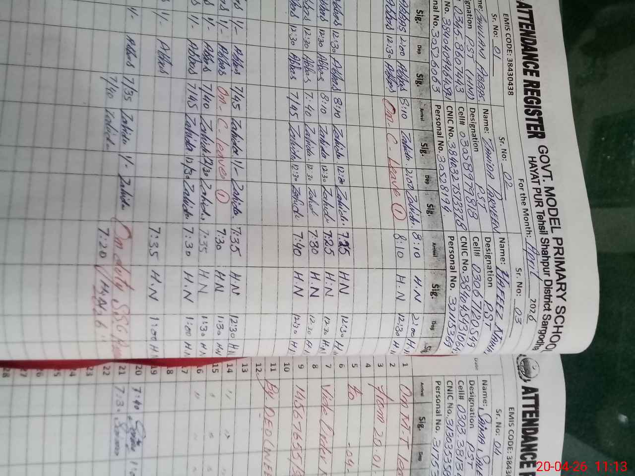 | CNIC | Full Name | Designation | R/C | Absence During Last Calender Month |