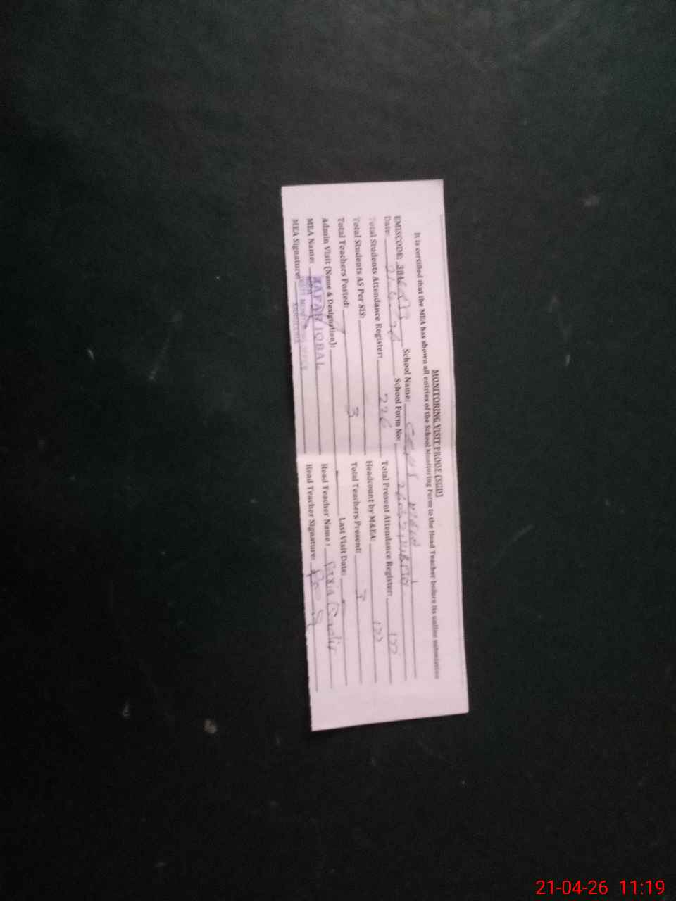 | Attendance Register | Head Teacher | MEA with School | Visit Proof |