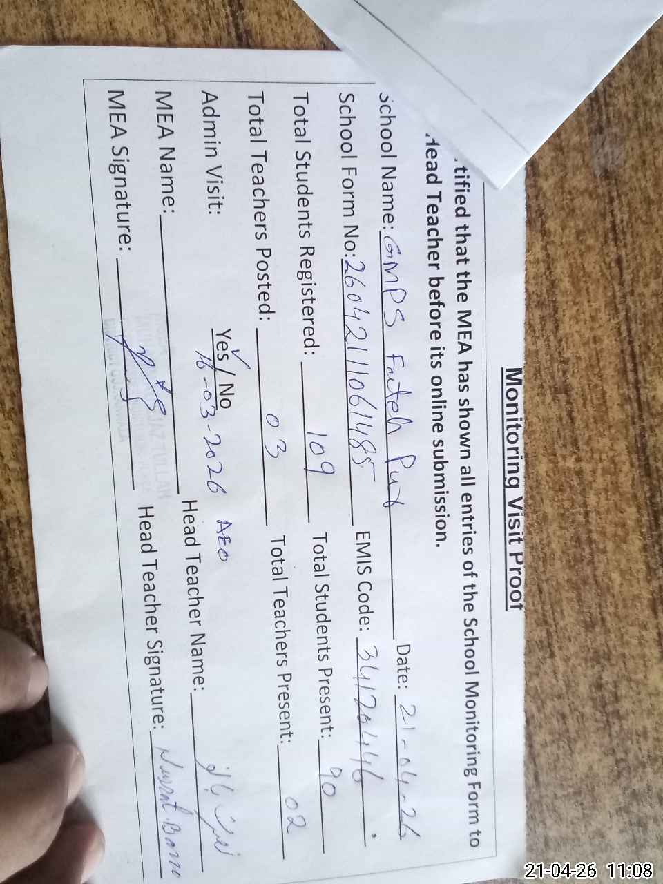 | Attendance Register | Head Teacher | MEA with School | Visit Proof |