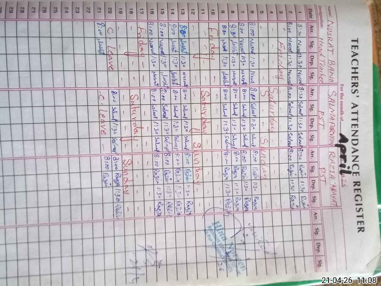 | CNIC | Full Name | Designation | R/C | Absence During Last Calender Month |